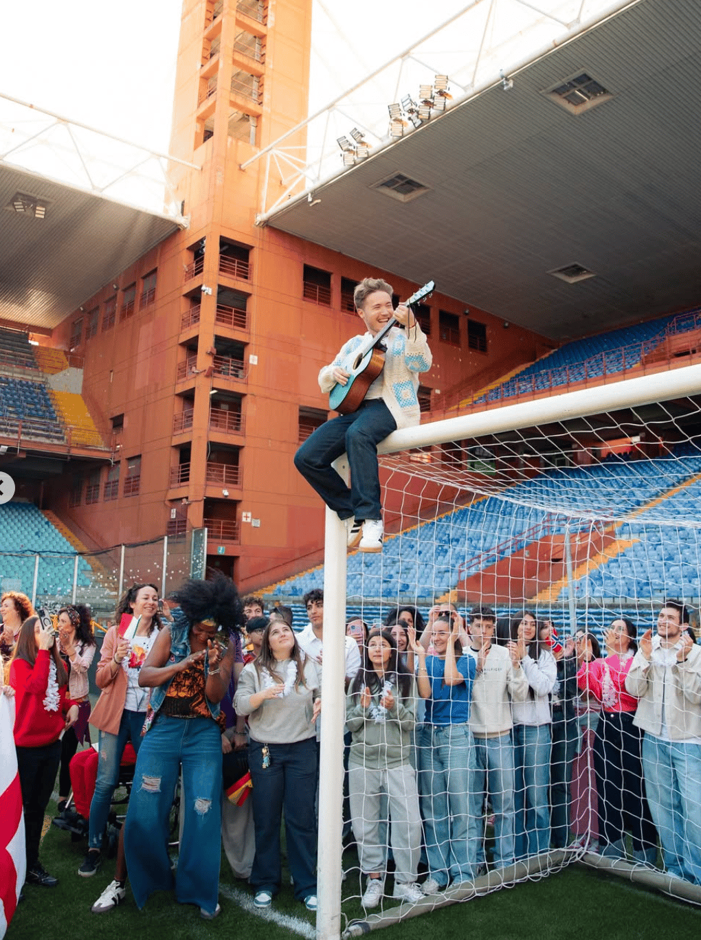 Il videoclip di “A me mi piace” è un piccolo manifesto di spontaneità collettiva. Girato per le vie di Genova insieme a decine di fan, alterna scene nel centro storico e all’interno dello Stadio Luigi Ferraris.